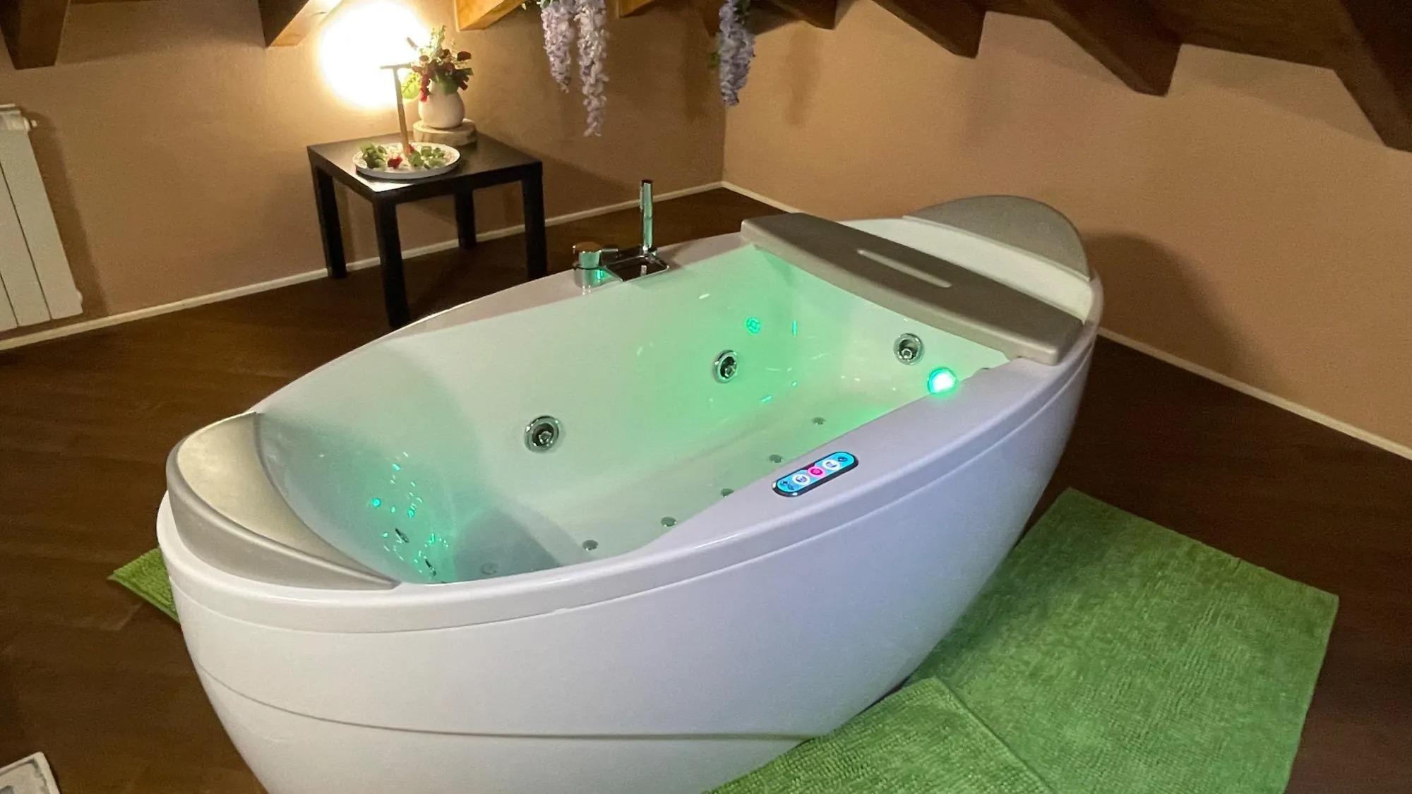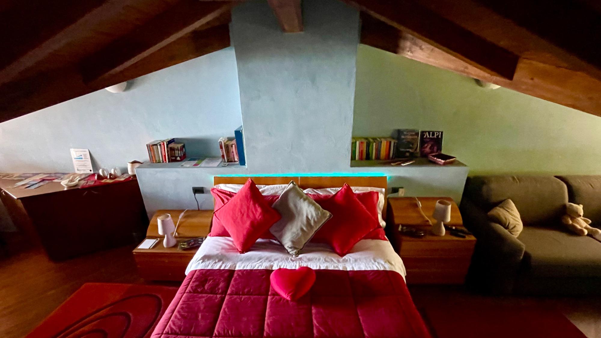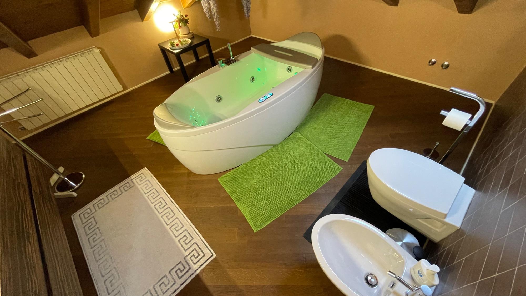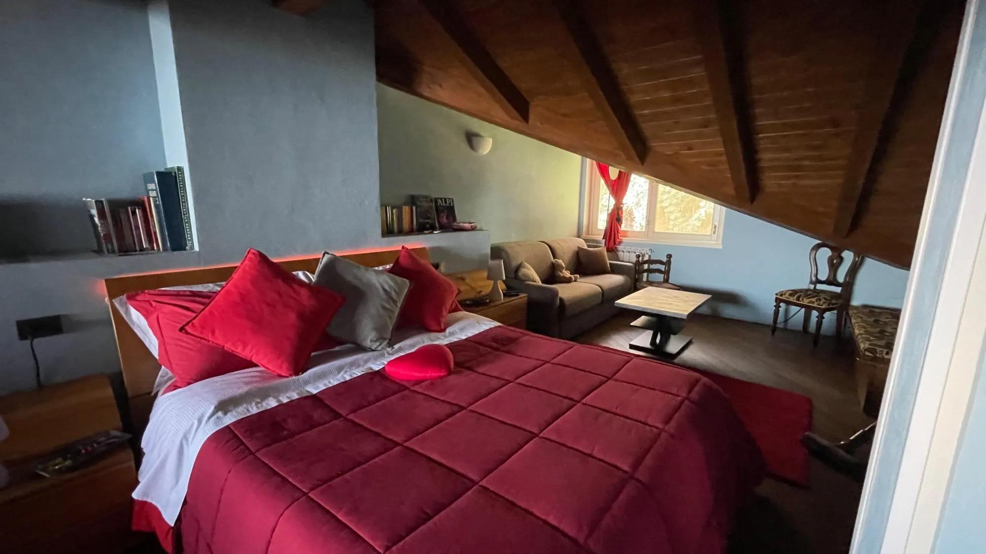 La camera, situata in una mansarda luminosa e rifinita in legno, combina eleganza e comfort in un ambiente intimo e rilassante. Dispone di climatizzatore, pavimento in parquet e bagno privato con vasca idromassaggio, posta sotto le travi, per un’esperienza di totale benessere.